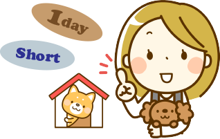 家族と離れ、突然知らない場所で過ごすのは、ワンちゃんにとって大きなストレス。 1時間単位でワンちゃんをお預かりするショートステイ(〜3時間)や、 ワンデイステイ(3時間〜10時間)であらかじめ練習をしておけば 安心してお泊まりできます♪